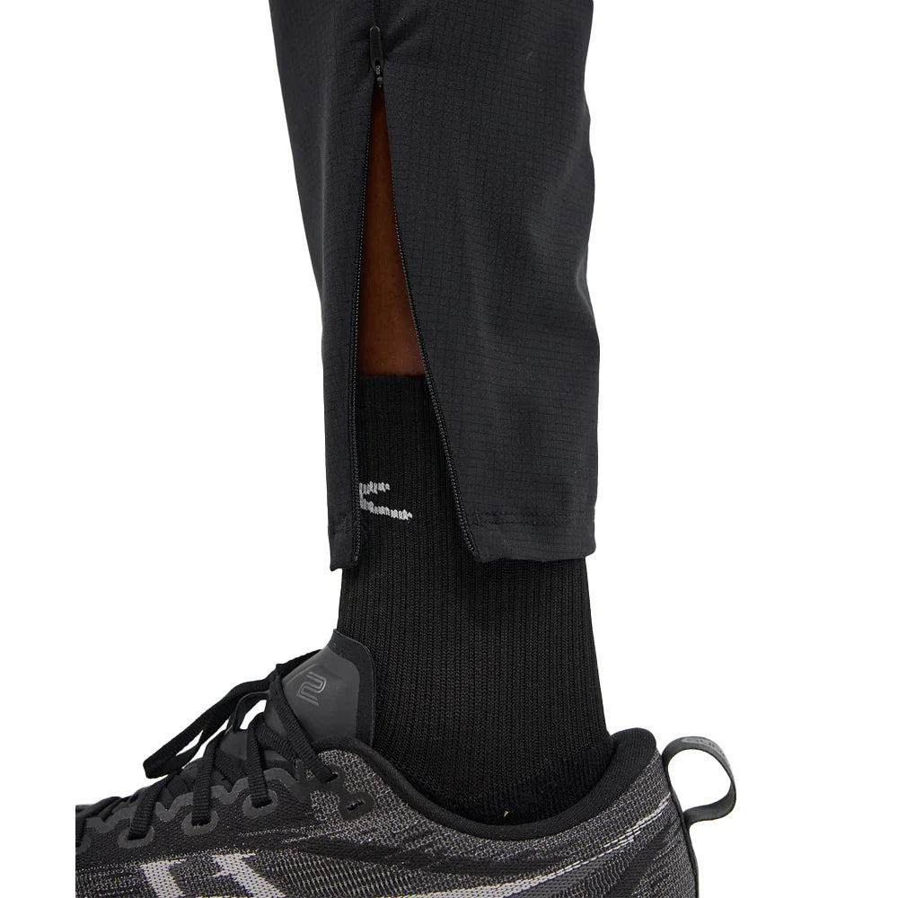 Our community sourced and tested run pant, an upgrade for runners by runners. A slim fit with extreme taper, combo fabric piecing at fitted calf, and concealed zippers at hem. Storage system includes 2 pockets with zipper closure. Reflective branding at front and back body adds touches of visibility, with a custom exposed elastic waistband with branded and Taxi bartacks.