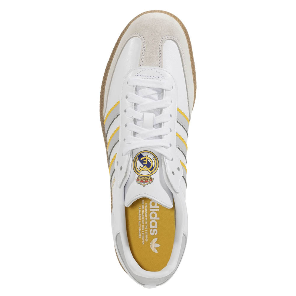 Created so Real Madrid fans can roll with soccer style off the pitch. An adidas footwear icon, the Samba is famous for its soft leather upper and suede T-toe. This pair is finished in Real Madrid's famous home colors and shows off a team crest on the heel tab so no one can mistake your soccer fandom.
