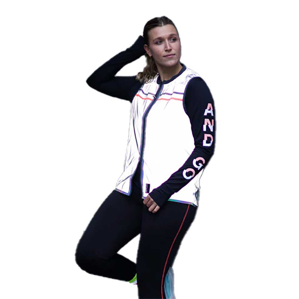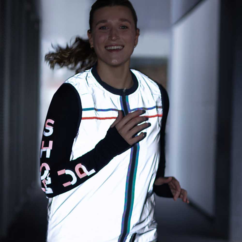 the vibrant fluorescent red details bring a pop of color during the day, while the reflective and iridescent fabrics makes you fully visible at night.