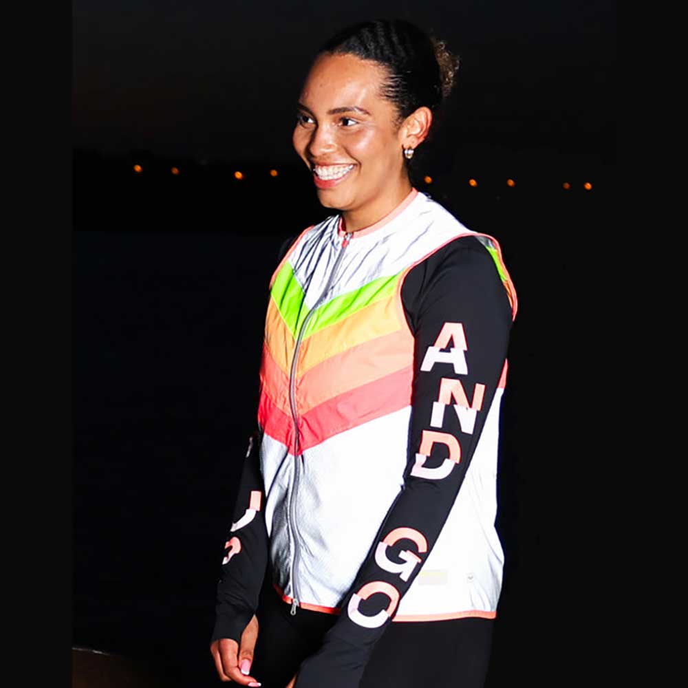 This reflective vest is designed to make you extra visible when running at night. The signature GOFLUO rainbow colors and beautiful neon coral hem help you spread good vibes and bring an upbeat splash of color to your runs.