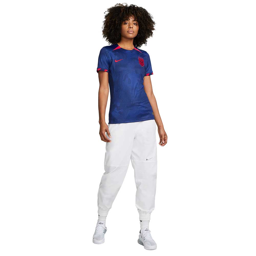 The USWNT 2023 Away jersey is all about the stars and stripes. A red, white and blue colorway adds a touch of national DNA while details at the collar and sleeves pull inspiration from the points of a star to add bold style. Stars over the team crest pair with a hidden graphic on the inside commemorate the team’s unrivaled 4 world championships. Like other jerseys in our Stadium collection, this one pairs replica design details with sweat-wicking technology to give you a game-ready look inspired by your favorite team.